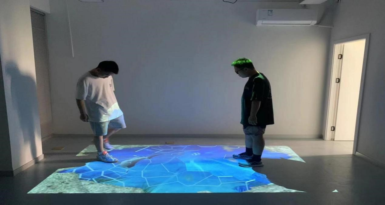 AR虚拟投射互动宣泄系统,融合心理游戏放松理论,采用计算机视觉技术和多媒体投影显示技术,营造一种似真亦幻的动感的现代化全新的交互式互动体验,将来访者与屏幕之间互动起来,进而帮助来访者达到放松情绪的目的。