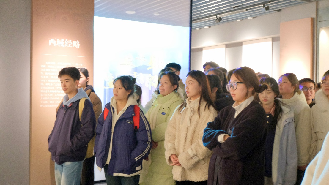 在讲解员的带领下,支部成员们详细了解了国家版本馆“一总三分”的总体布局和西安分馆的项目建设、规划设计、建筑特点以及收藏版本等情况。在讲解员的引导下,大家参观了《楮墨遗珍万里同风——丝绸之路版本展》及《赓续文脉踔厉前行——中华文化经典版本展(西部篇)》两个特色展厅,展厅以图文展板、场景复原、多媒体技术、雕塑等形式展现了丝绸之路文明和中华文化的深厚底蕴。这些展览充分展示了以西部为主的中华经典版本故事和历史发展脉络,使同学们深入了解国家版本馆的建设背景、设计理念及其所承载的文化使命,深刻感悟到中华民族源远流长、博大精深的历史文化。