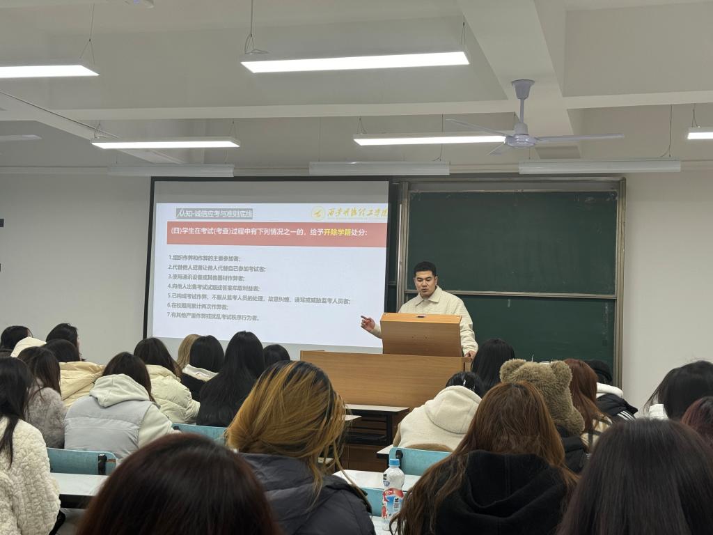 班会上,各辅导员老师围绕“文明考风,诚信考试”主题,重点解读了学校考试纪律条款,提醒同学们在期末考试期间要时刻牢记考试纪律,遵守考试规定。面对考试,存有取得优异成绩的想法无可厚非,然而通过“走捷径”的手段获得不属于自己的成绩却断不可取,同学们要有自我约束力,端正考风考纪,培养自己的诚信意识。同时,老师们还特别指出了考试违纪的后果,让在场的每一位同学深刻意识到不诚信行为的严重后果,起到了一定的警示作用。