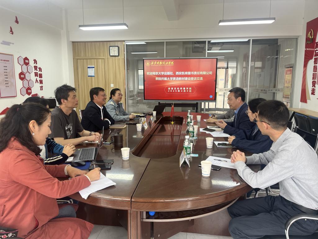 2025年4月9日上午,语言文化传播学院在多功能会议室举办“南京大学出版社、西安凯育图书出版有限公司与语言文化传播学院大学英语教材建设座谈会”。学院马庆林院长、刘勇副院长及大学英语教研室主任史晓亮、教材编写组组长杨茹、潘萌等热情接待了南京大学出版社社长助理兼高校教材中心主任蔡文彬、西安凯育图书出版有限公司总经理杨书涛一行。