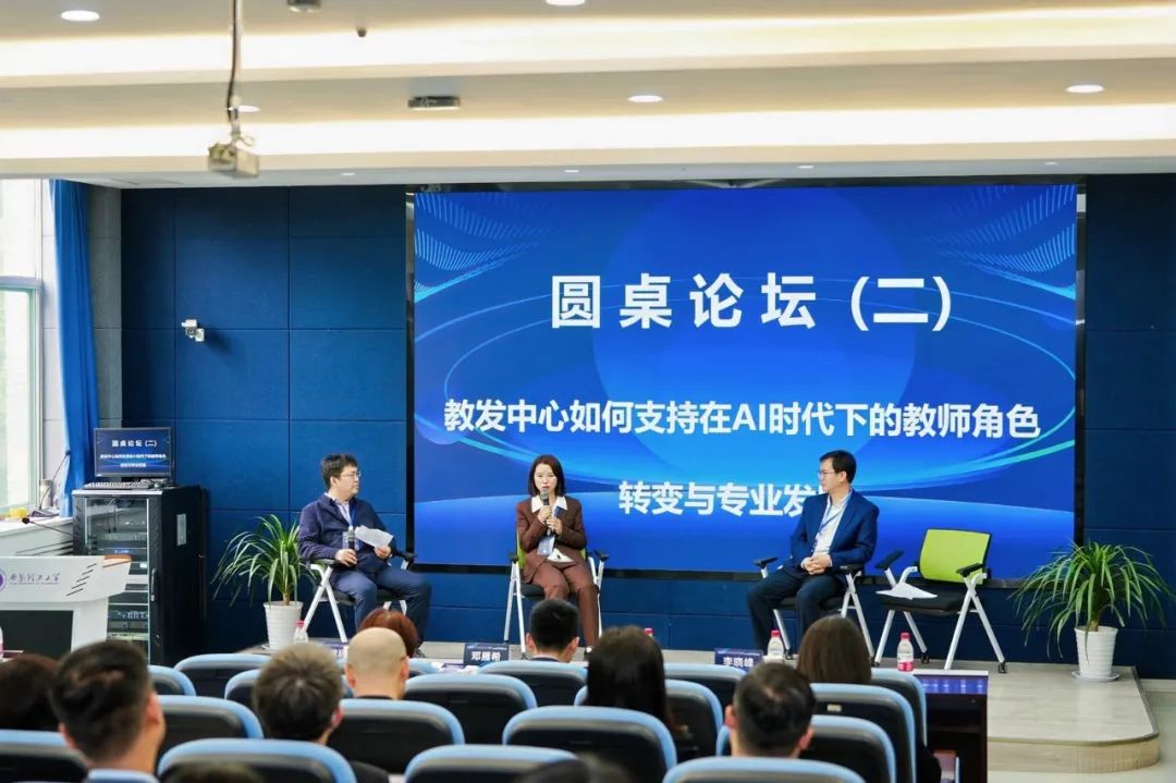 在“教发主任圆桌论坛”环节中,我校教师发展中心副主任郝丽静应邀与来自全国各高校的教师发展中心主任及专家学者进行了深入的交流与讨论。她就教发中心如何支持在AI时代下的教师角色转变与专业发展展开,分享了通过系统性培训将AI素养贯穿教师发展全周期并助力教师专业发展的创新实践路径。