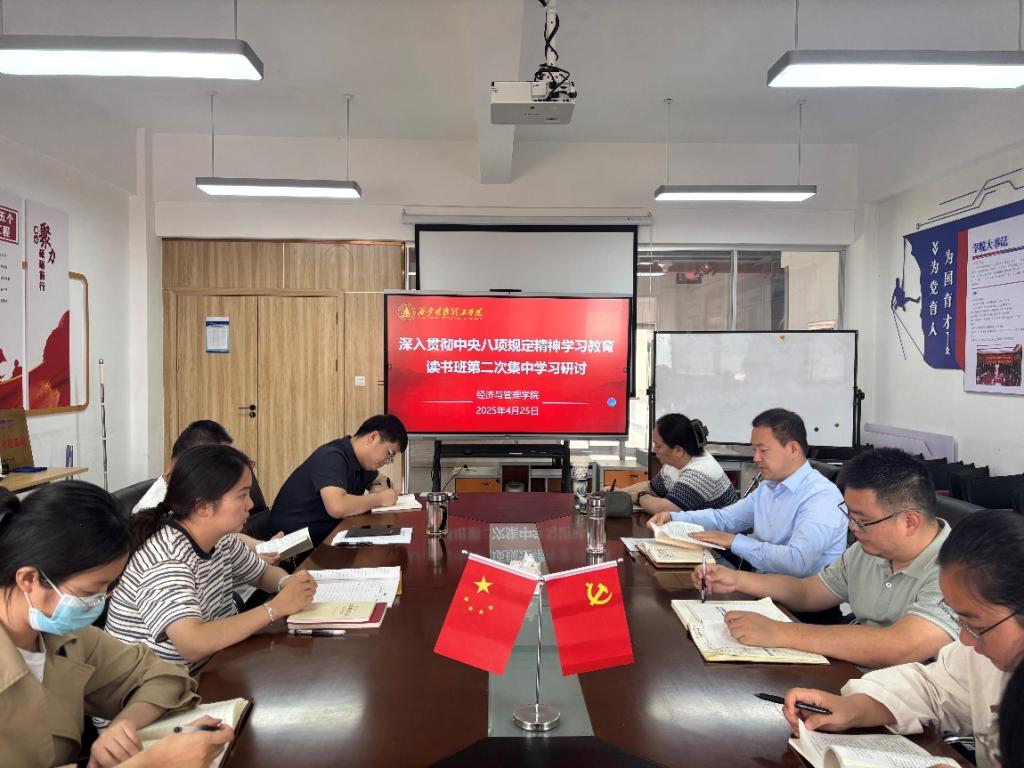4月25日,经济与管理学院举行深入贯彻中央八项规定精神学习教育专题读书班暨党委理论学习中心组学习会,原原本本研读《习近平关于加强党的作风建设论述摘编》第1-4章内容。学院党委委员、师生党支部书记和团委书记参加了会议,会议由学院党委书记兼行政副院长何文举主持。