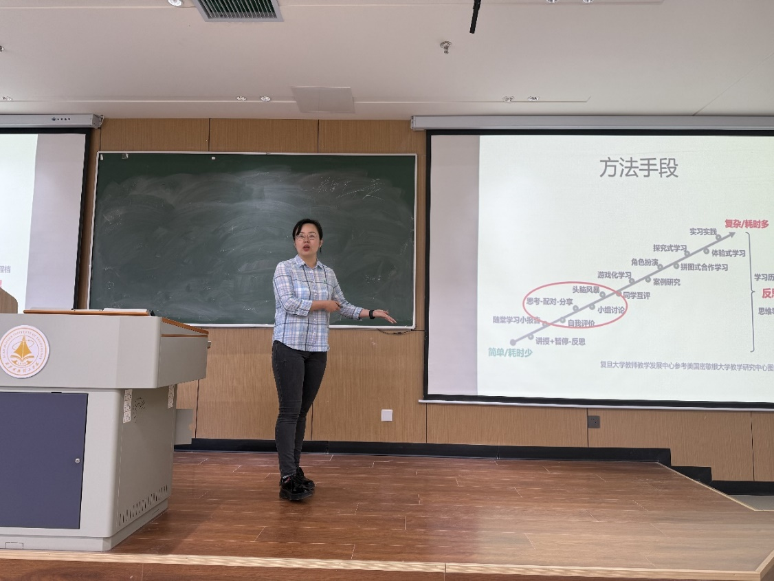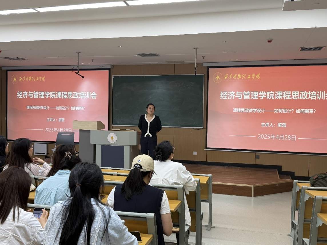 培训中,学院师德标兵、校级教学名师解蕾副教授围绕“课程思政教学设计——如何设计?如何撰写?”的主题,从教学设计概念、撰写方法及课程思政融入路径进行详细讲解。解蕾老师通过实际案例与理论结合,帮助青年教师明晰教学设计的系统性和重要性;结合优秀教学设计范例,解读各板块的撰写规范与技巧,为青年教师提供了实用的写作指导。针对“如何在教学时引入课程思政”,解蕾老师指出,课程思政旨在将思想政治教育融入教学全过程,挖掘专业知识与思政元素的契合点,如在经济学课程中结合国家经济政策解读、企业社会责任案例,在管理学课程中融入团队协作精神、职业道德规范等内容,通过案例教学、小组讨论等多样化教学方法,实现思政元素与专业知识的有效融合,达成育人目标。