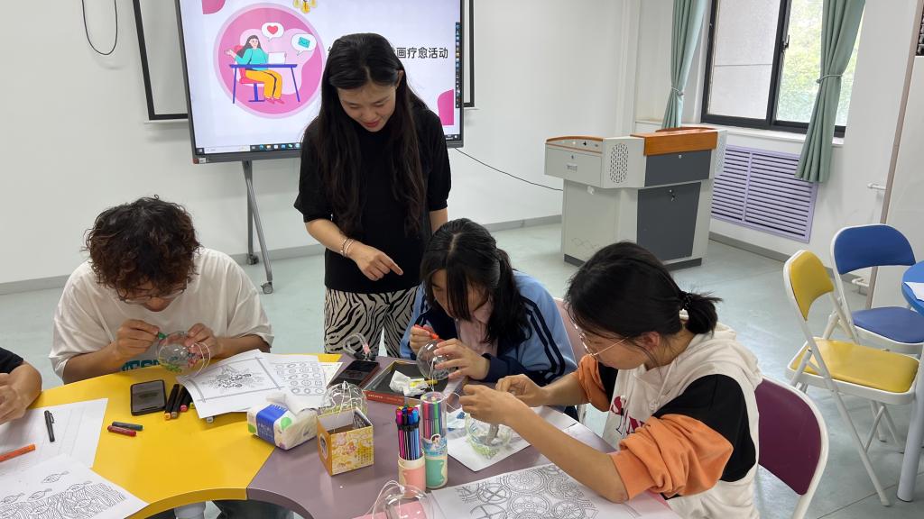 活动伊始,谭辉向同学们详细介绍了绘画疗愈的原理与本次活动的意义,鼓励大家放下顾虑,自由地通过画笔表达内心世界。随后,霍瑜婷老师分发绘画工具与空白风铃后,同学们纷纷拿起画笔,专注地投入到创作之中,一个个独具创意的风铃在画纸上逐渐成型,每一笔都倾注着同学们内心的情感与思绪。