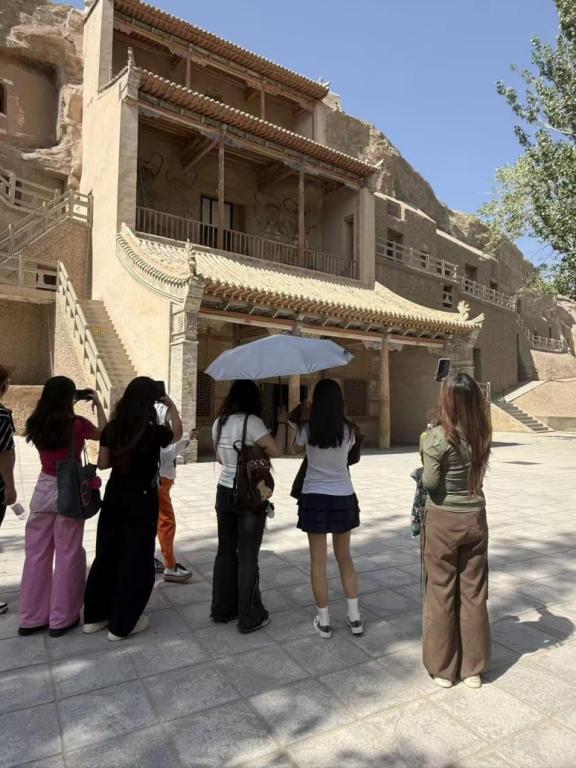目前,这场文化探索之旅仍在继续。接下来的行程中,师生们还将前往榆林窟——这座被誉为“莫高窟姊妹窟”的艺术宝库,探寻华体会在线官网未被广为人知的壁画珍品;走进鸣沙山月牙泉,在“沙水共生”的奇景中感受自然与人文的交融,从大漠风光中获取简约、大气的设计灵感。