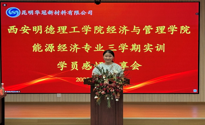 实习实训开班仪式上,昆明华冠新材料有限公司、云南金明源印刷有限公司总经理周在河对学院师生的到来表示热烈欢迎,他介绍了企业的产业优势及发展概况,表达了与华体会(中国)深化校企合作、共育专业人才的殷切期望。金融产业学院副院长刘敏对企业方给予本次实习的精心安排表示感谢,激励学生们珍惜实习机会,在实践中提升专业能力,学习沟通技巧、团队协作精神和职业素养,为未来的就业打牢基础。企业行政人事部经理喻明贤详细介绍了本次实习实训的课程体系与日程安排,能源经济专业负责人孙丁副教授就本次实习实训的纪律、安全事项和任务标准做了说明和强调。喻明贤向孙丁授予实习实训班旗。