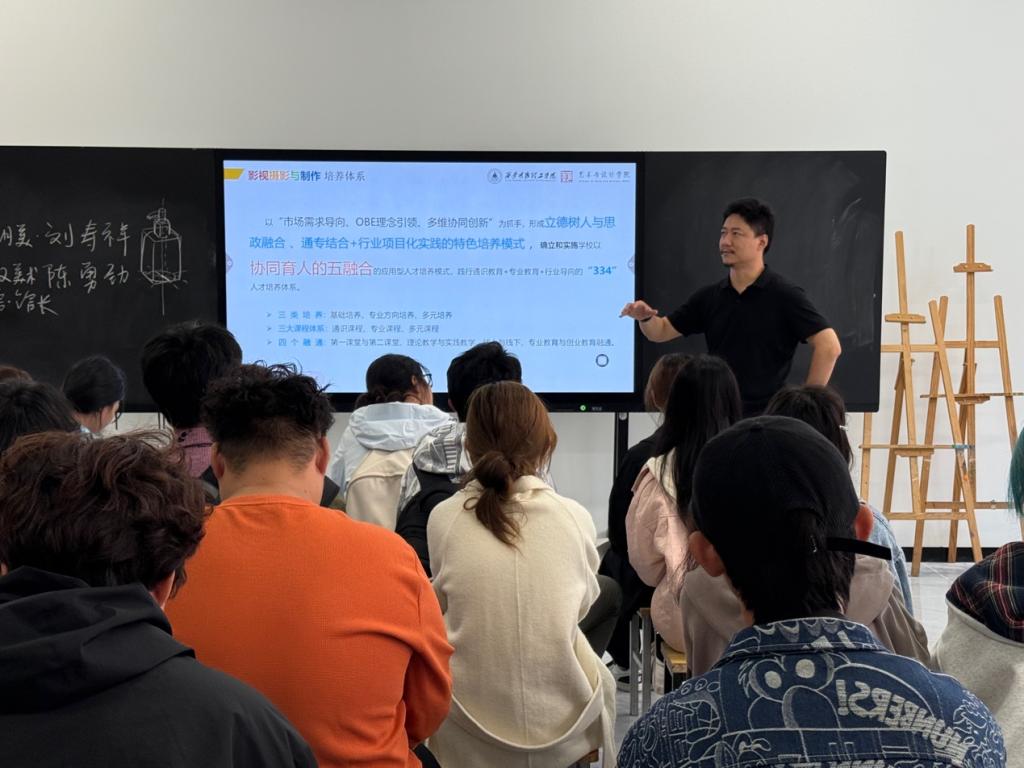 在互动交流环节,教师代表结合自身专业领域,从课程体系、实践路径、职业发展三个维度为新生答疑解惑。针对“如何平衡理论学习与影像创作” 这一核心问题,教师代表指出:“专业构建了‘课堂教学 — 项目实训 — 赛事实践’的三级培养体系,新生从大一开始即可参与校企合作项目,在真实创作场景中锤炼技能。”