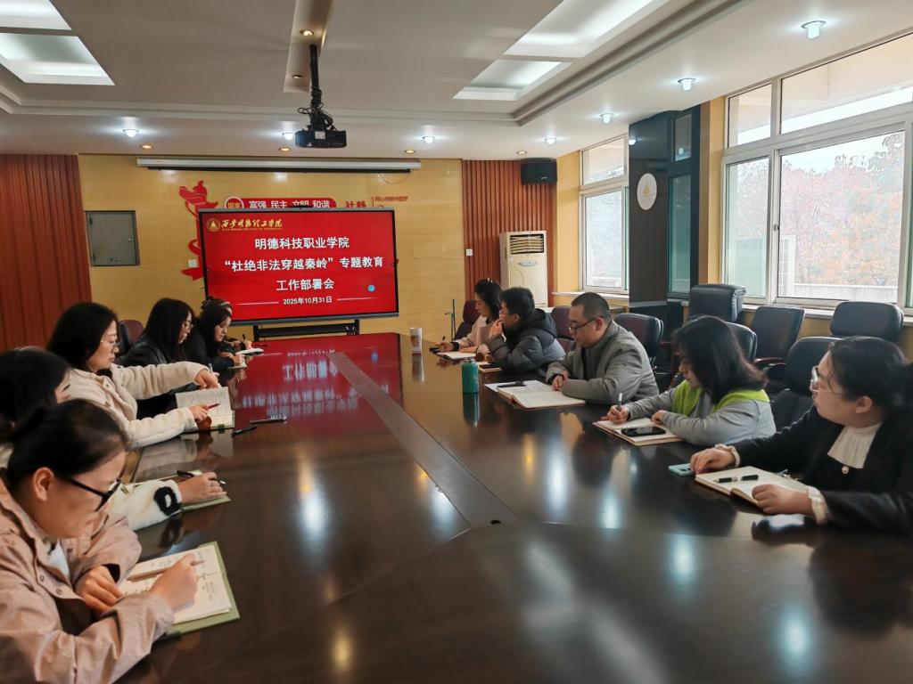 为切实增强师生安全意识,筑牢生命安全防线,维护秦岭生态环境,10月31日上午,明德科技职业学院在长安校区明理楼216会议室、莲湖校区德雅楼A102会议室线上线下联合召开“杜绝非法穿越秦岭”专题教育工作部署会。会议由党总支副书记王飞主持,全体辅导员参加。