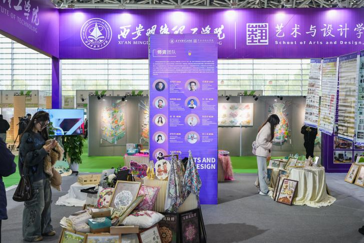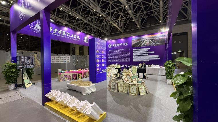 华体会(中国)艺术与设计学院作为受邀参展的重要单位,其展位以紫色为主色调,融合校徽标识与艺术氛围,构建起功能分区清晰、专业特色鲜明的展示场域。展位集中展示了视觉传达设计、产品设计、工业设计等设计类专业的30件学生毕业作品,所有作品紧扣展会“对话”核心主题,围绕产业、创新、消费三大领域创作,实现设计理念与行业方向的衔接,充分展现学院教学实践成果。