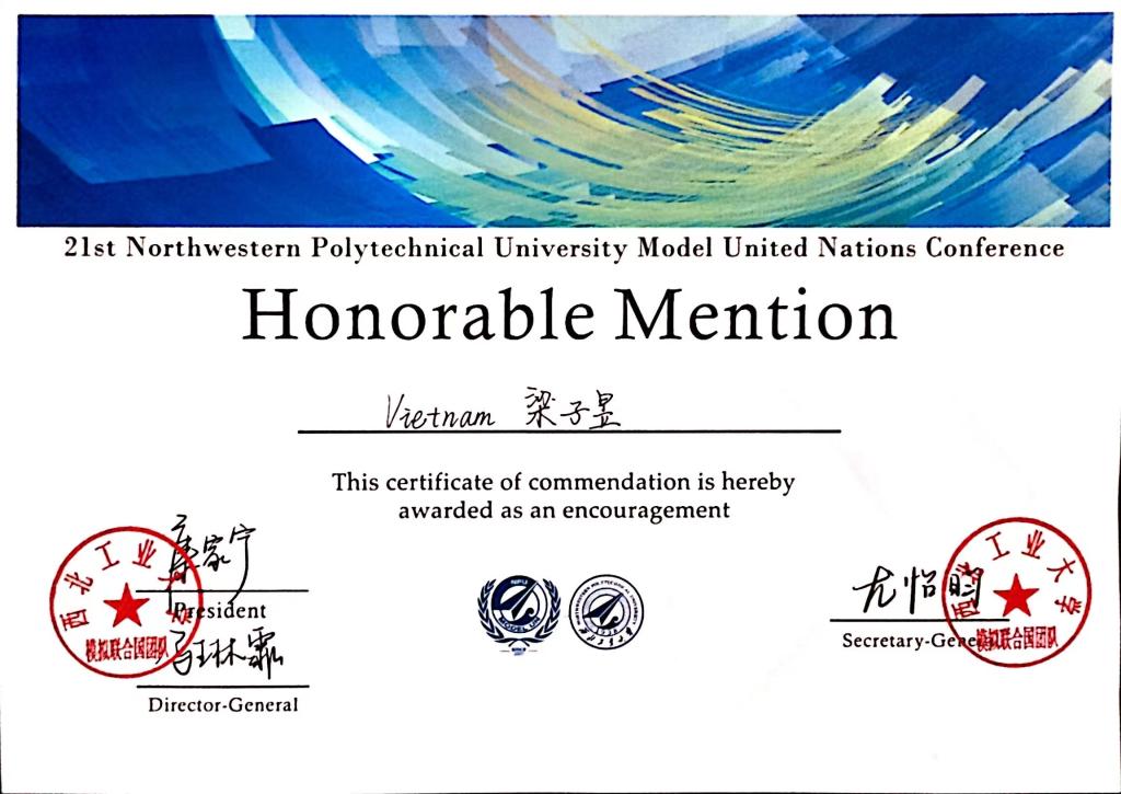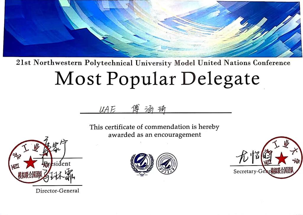 近日,第二十一届西北工业大学模拟联合国大会成功举办。我校模拟联合国团队共派9名代表参加本届大会并斩获个人奖二项,分别是最佳提名奖(Honorable Mention)——梁子昱,以及最受欢迎代表奖(Most Popular Delegate)——傅涵琦。