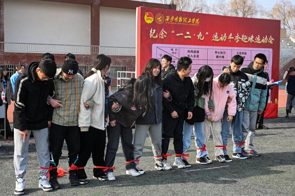 “共同进退多人多足”,是最考验参赛选手团结协作能力与默契配合程度的项目,发令声响起,有的队伍齐喊口号前进,有的稍显缓慢,看似紧张激烈的赛场时不时传来欢声笑语;“齐心协力跳大绳”,每队派出10名参赛选手,2人负责摇绳,8人负责绕“8”字起跳,两名负责摇绳的队友奋力摆动双臂,其他队员则摸索配合调整步调与时机;“斗志昂扬撕名牌”,在保证人身安全的情况下,参赛者们在赛场内追逐争夺对手身上的名牌,有人奋力保护队友,有人勇敢冲锋夺分,现场气氛热烈。最终,经过一番比拼,智能制造与控制技术学院、高等职业技术学院、语言文化传播学院分别获得团体第一、二、三名。