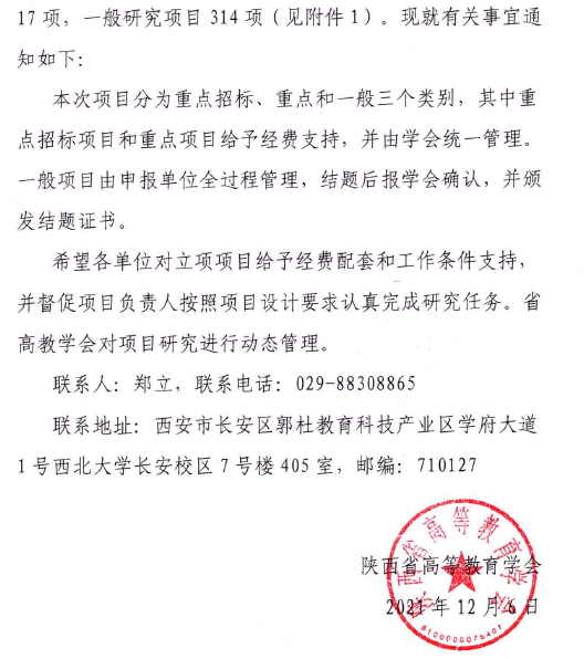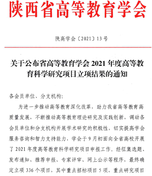 12月6日,陕西省高等教育学会发布《关于公布省高等教育学会2021年度高等教育科学研究项目立项结果的通知》陕高学会〔2021〕13号,我校立项四项课题,全部由经济与管理学院教师主持或参与。