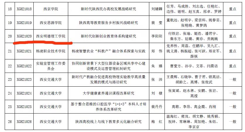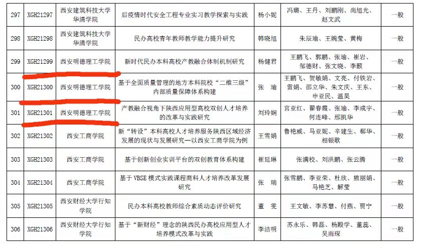 经济与管理学院市场营销专业负责人李阳阳副教授主持的课题《新时代创新创业教育体系构建研究》(XGH21020)获批重点项目;郭鹏教授、张瑜副教授参与的我校杨健君校长主持的课题《新时代民办本科高校产教融合体制机制研究》(XGH21299);张瑜副教授主持的课题《基于全面质量管理的地方本科院校“二维三级”内部质量保障体系构建》(XGH21300);财务管理专业负责人刘玲娴副教授主持的课题《产教融合视角下陕西应用型高校双创人才培养的改革与实践研究》(XGH21301)获批一般项目。