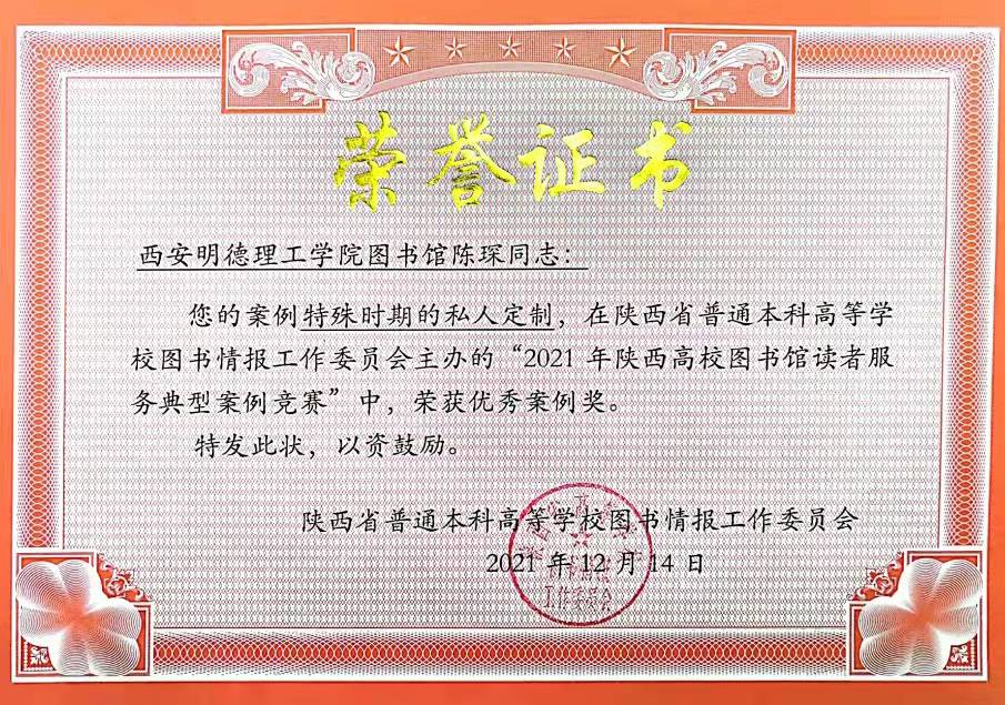 12月13日,陕西高校图工委公布“2021年陕西高校图书馆读者服务典型案例竞赛”获奖名单,我校图书馆陈琛提交的案例《特殊时期的私人订制》荣获优秀案例奖。