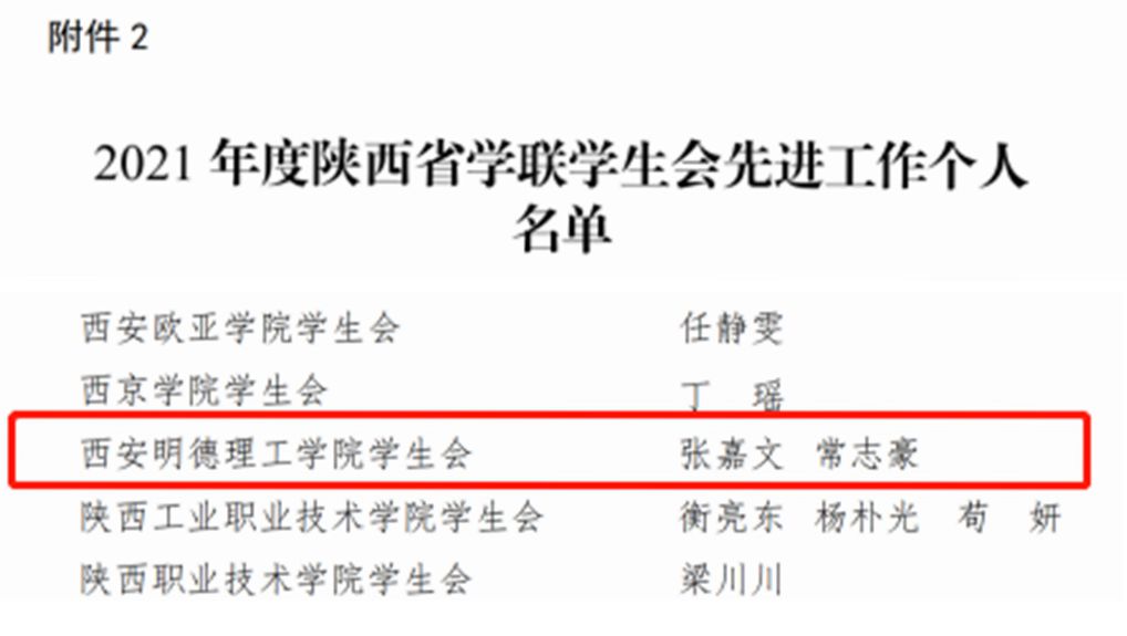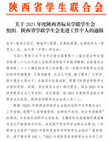 近日,陕西省学生联合会发布了《关于2021年度陕西省标兵学联学生会组织、陕西省学联学生会先进工作个人的通报》,其中我校学生会被评为“2021年度陕西省标兵学联学生会组织”,张嘉文、常志豪两名学生荣获“2021年度陕西省学联学生会先进工作个人”称号。