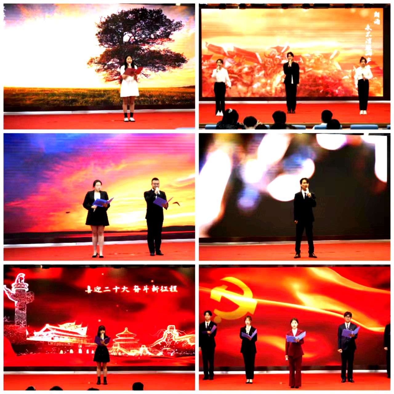 朗诵会由大学生艺术团的现代舞拉开帷幕。同学们朗诵了《永不消逝的声音》《青春》《致橡树》《今夜星光灿烂》《党旗颂》《喜迎二十大奋进新征程》等作品。青年学子用语言艺术讲述着先烈们在青春年华用生命守护的梦想,一副副坚韧的脊梁在炮火连天中闪耀着党徽的金光。