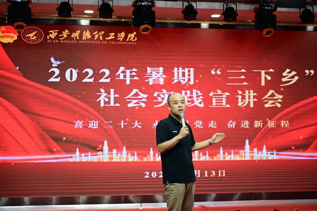 校团委书记童杨梓老师带领学生们回顾了学校暑期“三下乡”的发展历程,他鼓励大家从乡村振兴、返家乡、回母校、进企业、文艺支教等多方面组建团队参加本次社会实践活动。他表示,暑期“三下乡”社会实践活动是青年学子了解社会、认识国情、砥砺品格的重要途径,是广阔青年学生发挥自身优势,走进乡村、走进社会的重要形式。希望大家积极参与到三下乡活动当中,能够有所学习,有所收获。他从三个方面强调了暑期三下乡的要求,一是全心投入,增长才干;二是突出主题,讲求实效;三是加强保障,确保平安,并预祝今年的三下乡活动能够取得圆满成功。