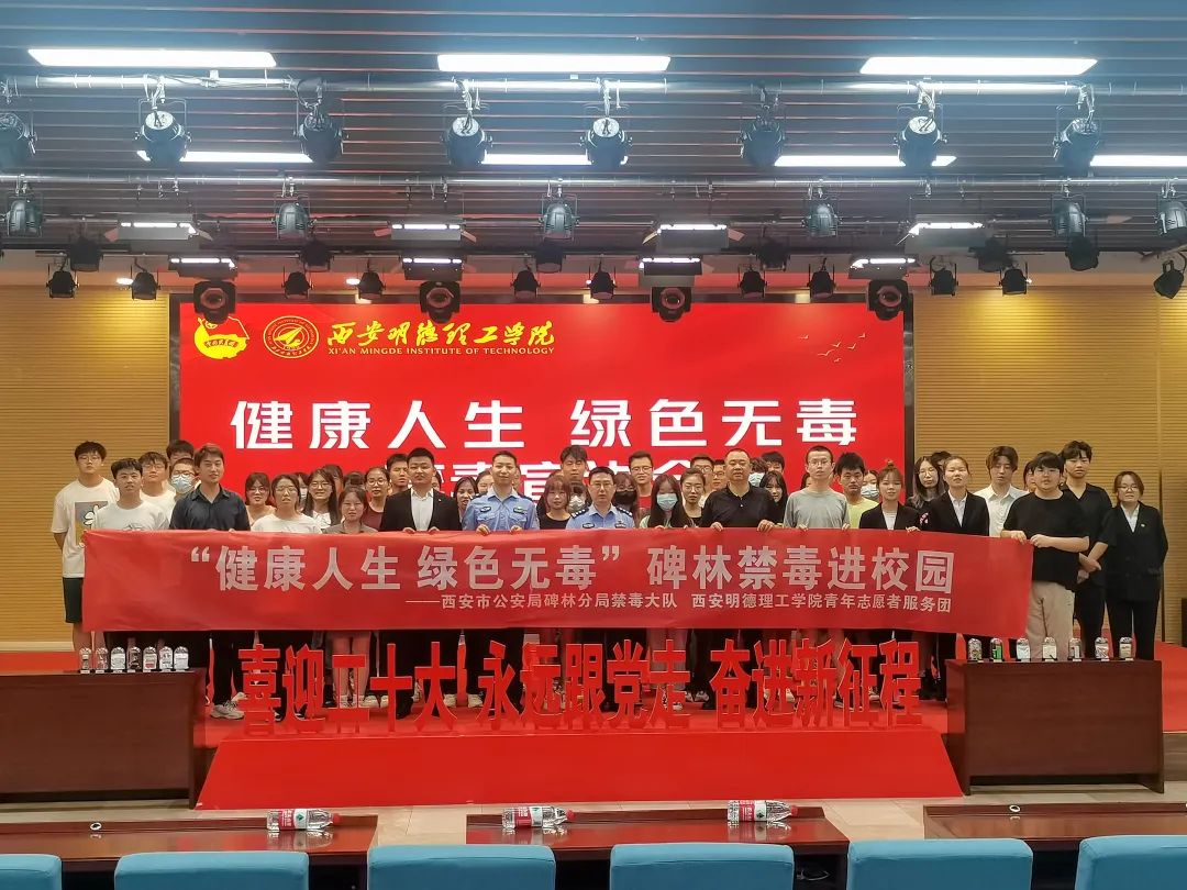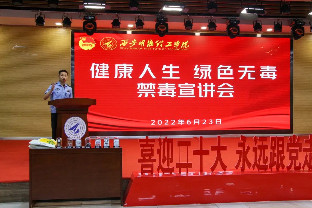 在第35个国际禁毒日到来之际,为进一步提高广大青少年禁毒、防毒、拒毒意识,着力构建平安和谐校园,让学生树立珍爱生命远离毒品的观念,西安市公安局碑林分局禁毒大队副大队长雷亚军、三级警长王豪,警官张茁琦走进校园,开展了以“健康人生▪绿色无毒”为主题的国际禁毒日宣传教育活动。学校党委学生工作部副部长兼校团委书记童杨梓、党委学生工作部学生事务管理科科长王飞、各二级学院团委书记,以及各学院师生代表参加了本次活动。