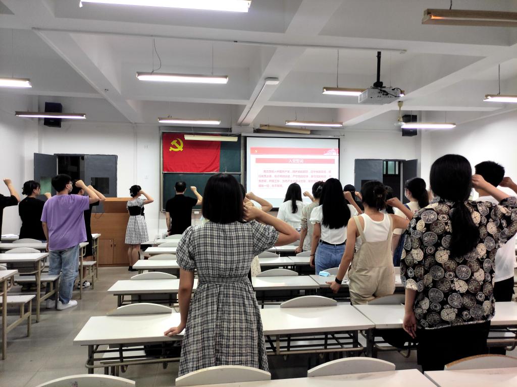 会议伊始,罗夫惠老师从党员组织关系转接流程、转接方式及注意事项等三个方面向全体毕业生党员解读了2022届毕业生党员组织关系转接相关事宜;紧接着,毕业生党员代表薛少轩和李恒两人依次从思想觉悟提升、党员先锋作用发挥、大学收获与感想等方面分享了在党组织培养下个人的成长故事,他们的精彩分享赢得现场师生的阵阵掌声;冯纪潮老师从文明离校和离校前工作安排两个方面为同学们做了毕业教育,并通报近期毕业生相关工作安排;何文举老师从共产党员为什么要坚定理想信念、共产党员怎样做到坚定理想信念、青年党员如何践行初心使命等三个方面为毕业生党员们讲了主题为“坚定理想信念,践行初心使命”的党课;最后,罗夫惠带领在场的全体党员重温入党誓词。