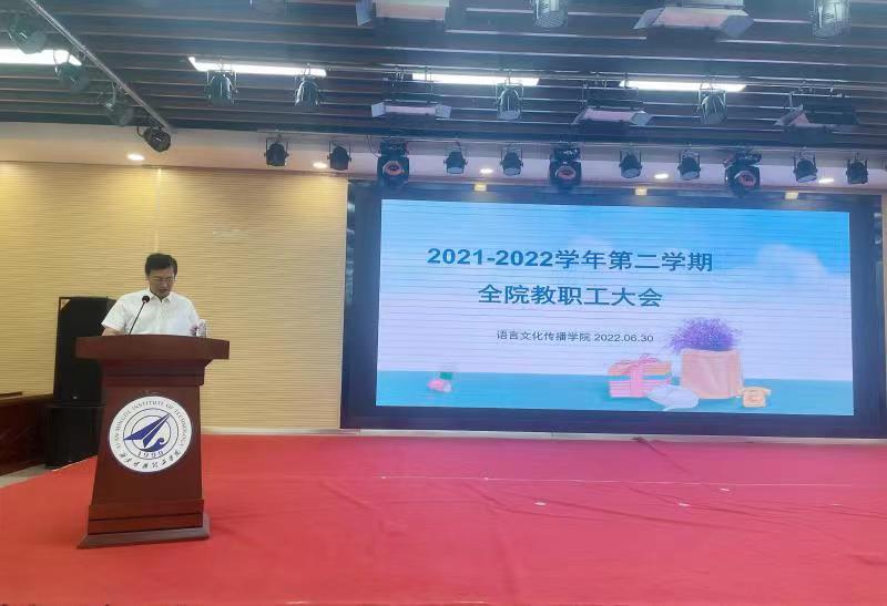 接着,院长马庆林教授作了题为《语言文化传播学院2021年度工作总结及2022年度重点工作计划》的工作报告。全面回顾了2021年我院专业、课程建设及课堂教学创新,人才引进,学科竞赛,实验室建设等重点工作的完成情况及所取得的成绩,深入分析了存在的问题,并从新专业建设、课程建设、学科竞赛、校企合作、国际交流与合作等方面对2022年的重点工作进行了安排部署,明确了目标任务。最后,马庆林对全体教师提出三点希望:一是认真设计准备并讲好每一节课,不忘教书育人的初心和使命,努力做好“四有”好老师;二是正确处理好教研相长的关系,做到教学和科研两手都要硬;三是正确处理好学校、学院、个人之间的关系,不断提升自我,勇于改革创新,敢于担当作为。