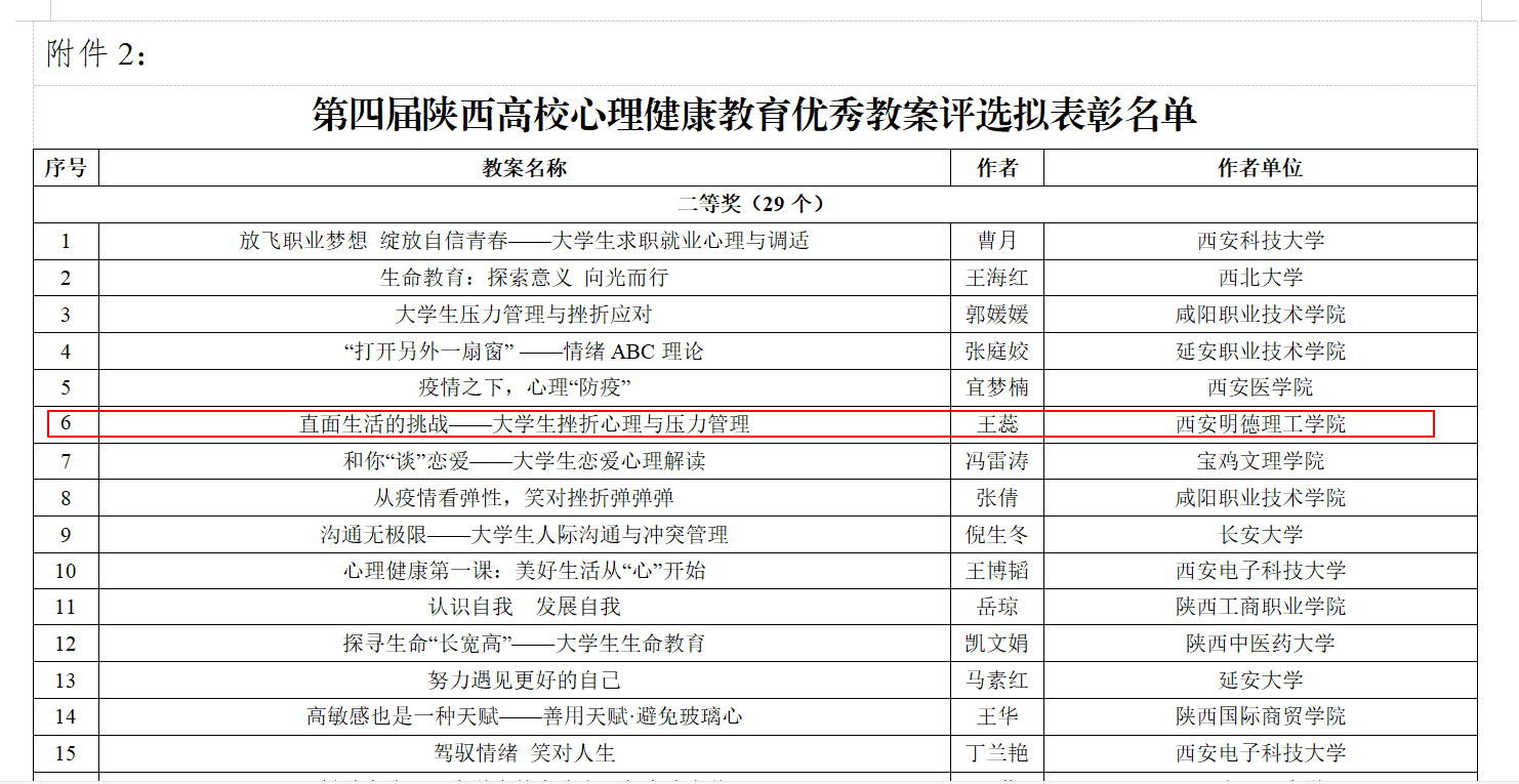 今年3月至6月,陕西省委教育工委开展第七届“阳光护航”心理育人宣传季实践活动,我校积极组织推选优秀作品参加了省级比赛。我校王蕊老师撰写的《直面生活的挑战——大学生挫折心理与压力管理》荣获心理健康教育课程教案省级二等奖;郭学鹏老师撰写的《重拾奋斗的信心——一例大三厌学学生的合理情绪疗法心理咨询案例》荣获心理健康教育优秀咨询案例三等奖。