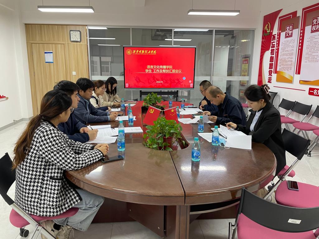 为进一步做好学生帮扶教育,促进学生全面健康成长,落实立德树人根本任务。10月26日,语言文化传播学院学生帮扶教育工作交流会在明志楼北406会议室举行。学校党委学生工作部副部长童杨梓、学生事务管理科科长王飞、学工专干那迪娜,语言文化传播学院全体辅导员参加会议。会议由语言文化传播学院党委副书记杨峰主持。