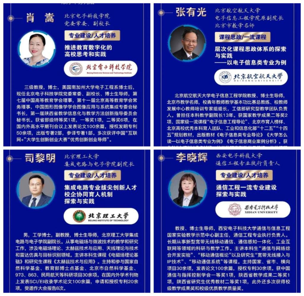 大会还组织了三场分论坛,来自全国电子信息类高校30多位学校教务处、院系负责人、专业负责人、实践教学负责人等就三个议题做了精彩报告。围绕“专业建设/教师发展、核心课程/课程思政、产教融合/实验实践”方面,进行广泛交流,分享专业建设经验、教学改革成果、人才培养模式、产教融合及协同育人实践等。