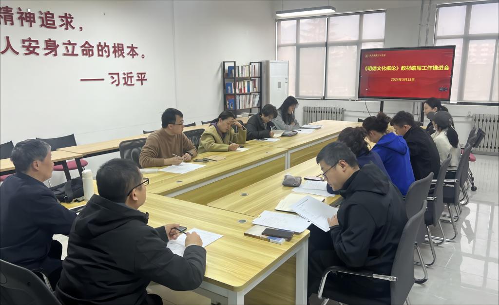 为了进一步强化办学特色,建设具有明德特色的校园文化,彰显明德文化育人特色,3月13日上午,《明德文化概论》教材编写工作推进会在行政楼306会议室召开。孔润年教授和全体教材编写组教师参加会议。会议由马克思主义学院副院长惠斌主持。