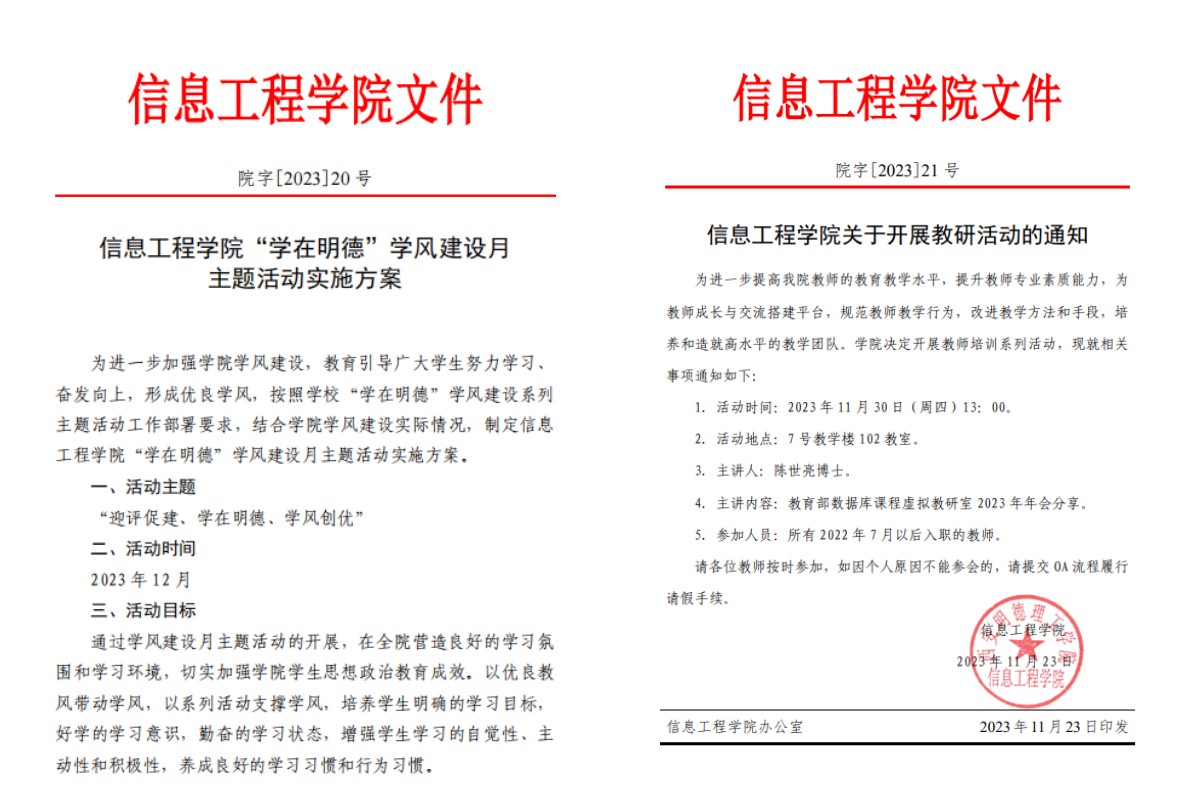 学风是大学精神的集中体现,是教书育人的本质要求,是高校的立校之本、发展之魂,也是学校灵魂和气质的集中表现。一年来,信息工程学院着力加强院风、教风、学风建设,学院教师躬耕教坛,学院学生刻苦学习、奋发向上,积极营造良好的学习氛围和学习环境。着力培养学生明确的学习目标、好学的学习意识、勤奋的学习状态,不断增强学习自觉性、主动性和积极性,养成良好的学习习惯和行为习惯。自2023年12月开始,信息工程学院启动开展“学在明德”学风建设系列主题活动,以优良教风带动学风,以系列活动支撑学风,通过“五抓五让”加强院风、教风、学风一体推进,保证学院学风建设持续向好。