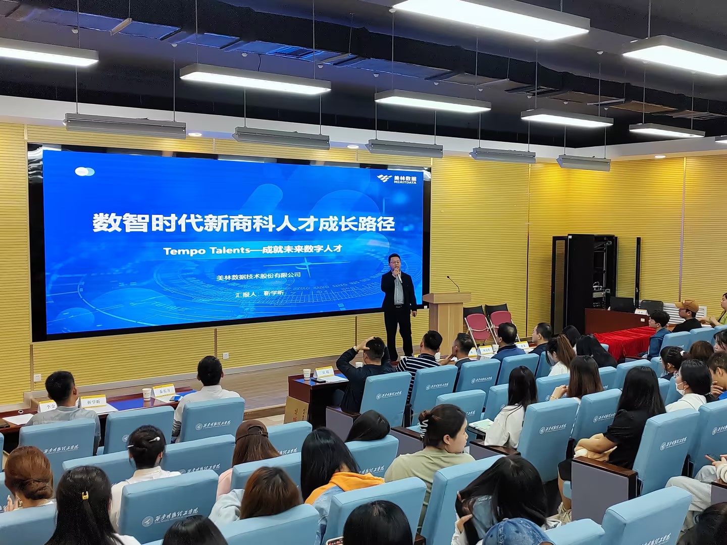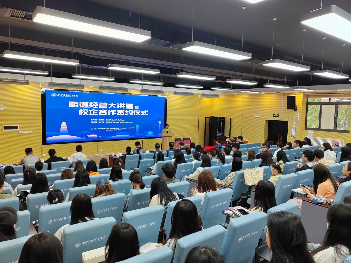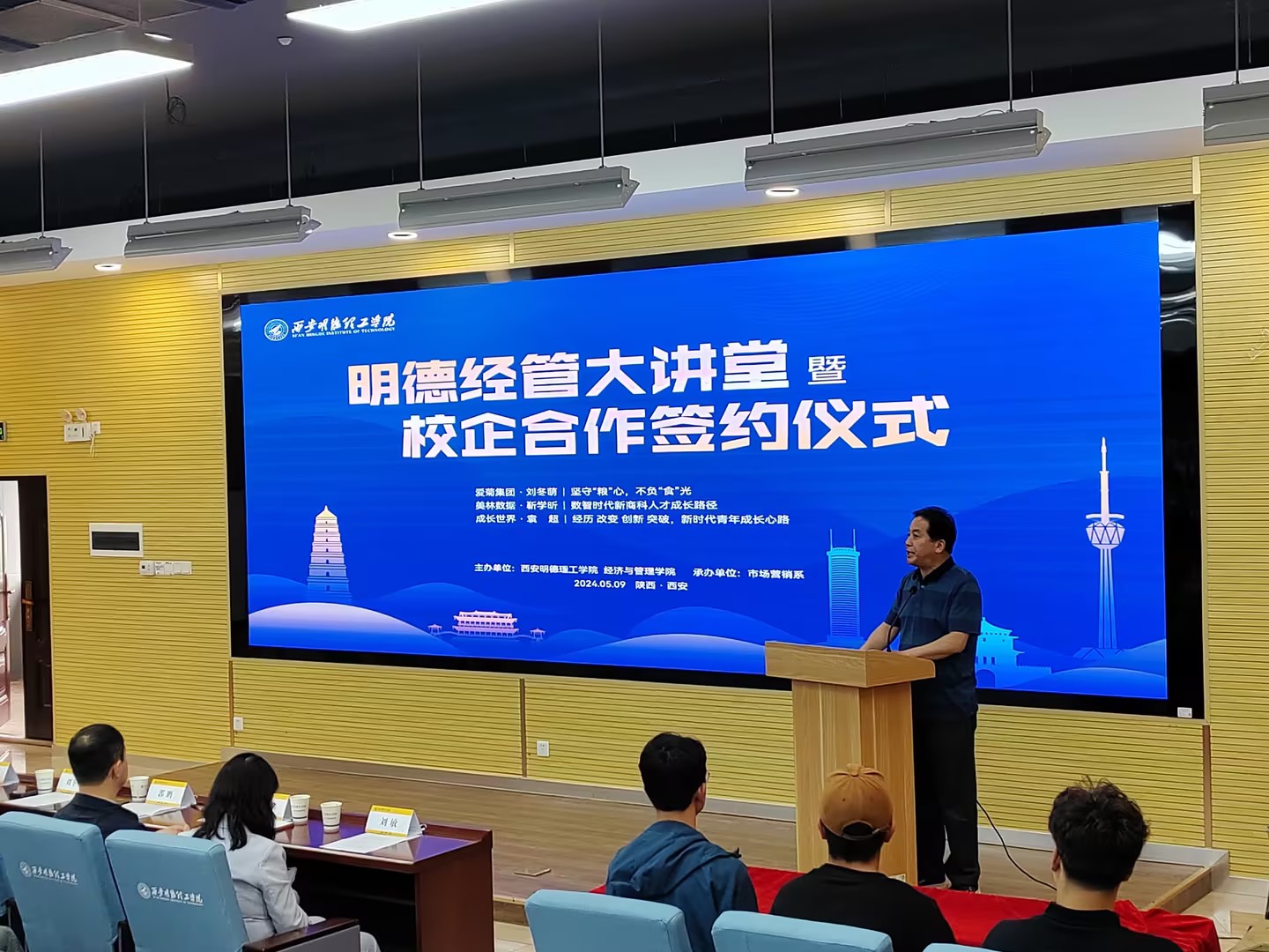 为深化产教融合,推进学校专业建设及人才培养模式创新,提高人才培养质量。5月9日,经济与管理学院在建德楼201举办明德经管大讲堂暨校企合作签约仪式。经济与管理学院院长郭鹏,党委书记兼行政副院长何文举,金融产业学院副院长刘敏,市场营销专业负责人秦东方、教师黄婕,西安爱菊粮油工业集团副总经理刘冬萌,美林数据技术股份有限公司产教融合事业部副总经理杨东涛、产教融合事业部客户总监李金龙、产教融合高级咨询顾问靳学昕,深圳成长世界教育科技有限公司总经理袁超以及师生代表150余人参加了活动。活动由黄婕主持。