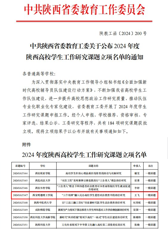 为进一步推动高校思想政治工作开展,加强辅导员队伍建设,高等职业技术学院在科研和实践探索中取得了新的进展。由高等职业技术学院学生工作团队申报的研究项目《“三个精神”融入民办高校学生思想政治教育中的路径研究》经经个人申报、学校推荐、资格审核、专家评选、结果公示、工委研究等程序,获批中共陕西省委教育工委2024年度陕西省高校学生工作研究课题立项。