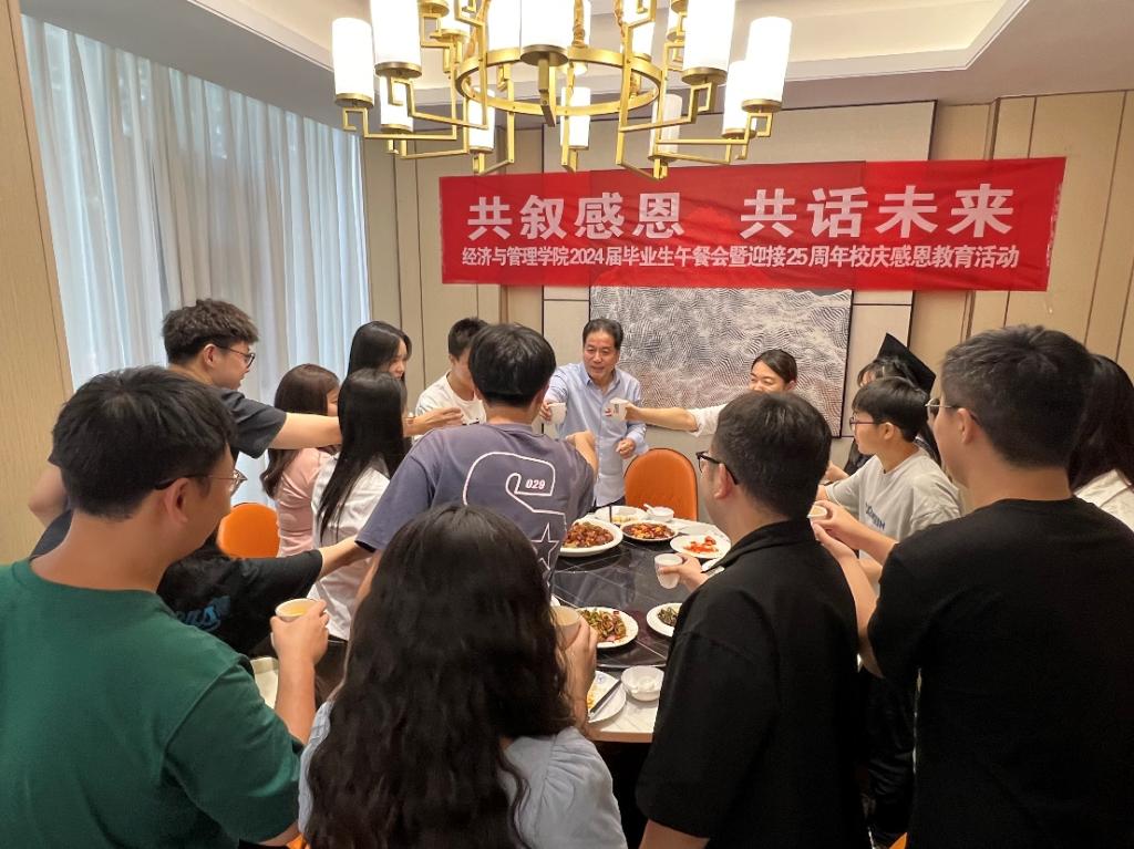 6月25日,经济与管理学院在学校沣味餐厅举办2024届毕业生午餐会暨感恩教育活动,学院院长郭鹏教授、党委书记兼行政副院长何文举、副院长许萍、副书记冯纪潮、办公室主任张蓓、教师代表秦东方、毕业班辅导员同50余名毕业生代表共谈大学成长和未来发展。活动由何文举主持。
