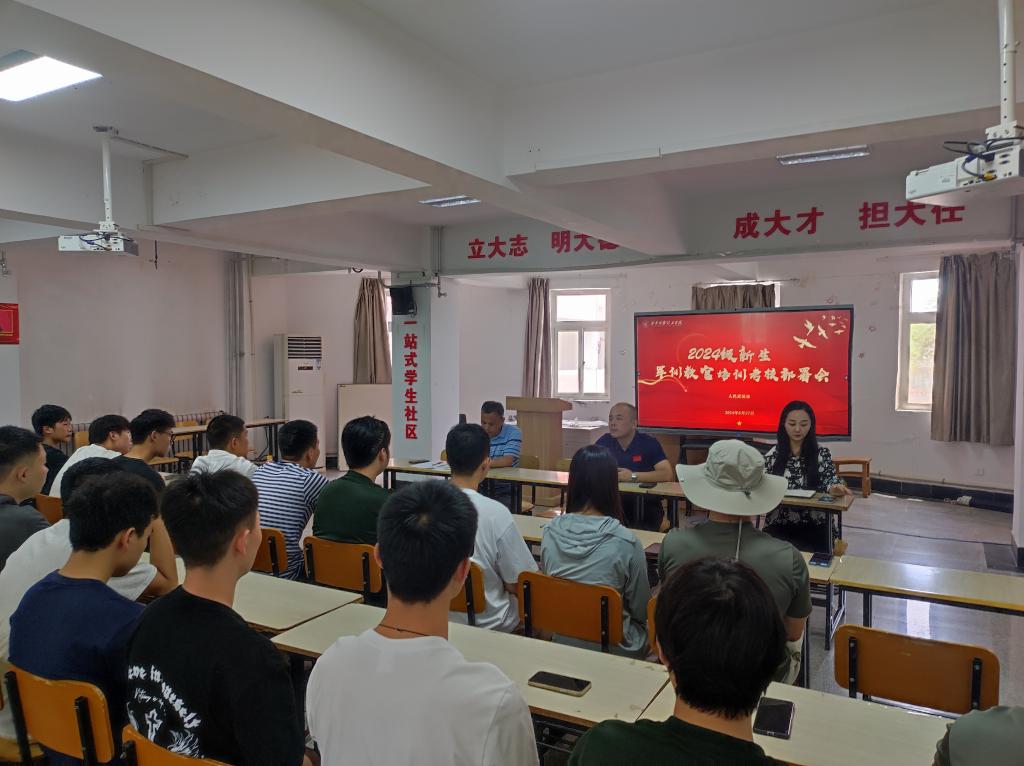 会上,童杨梓介绍了2024年我校将首次采取“自训+帮训”的新生军训新模式,安排了学生军训教官的培训考核工作,就学生军训教官关注的问题进行互动答疑和交流探讨,最后对参加培训考核的退伍在校学生们提出了几点要求:一是要提高思想认识,充分认识学校新生军训工作的重要意义和此次培训考核的必要性,以积极认真的姿态投入到培训考核中;二是要继承发扬部队优良传统,练就过硬本领,通过培训提升自己的军政素质,预祝同学们通过考核成为一名合格的高校军训教官;三是要严守带训纪律,以身作则,通过参加新生军训等重大活动为学校建设发展贡献青春力量,擦亮退役学生这张名片。同学们表示一定会端正思想认识,以饱满的热情,全心全意地投入培训;发扬吃苦耐劳的精神刻苦训练,不断提高自身的带训能力;严格遵守培训考核规定要求,在带军训任务中以教官的身份要求规范自己的言行,做到服从命令听从指挥,为学校军训任务的圆满完成贡献退伍学生应有的力量。