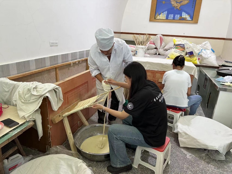 在张家山村调研期间,实践队探访了马师傅挂面作坊,学习了传统挂面制作技艺,感受了深厚的乡土文化与匠人精神。在作坊中,队员们不仅领略了传统工艺的魅力,更深刻理解了文化传承的重要性。在马师傅的指导下,学生代表体验拉面过程,切实体会劳动的艰辛,激发大家树立珍惜粮食的传统美德。