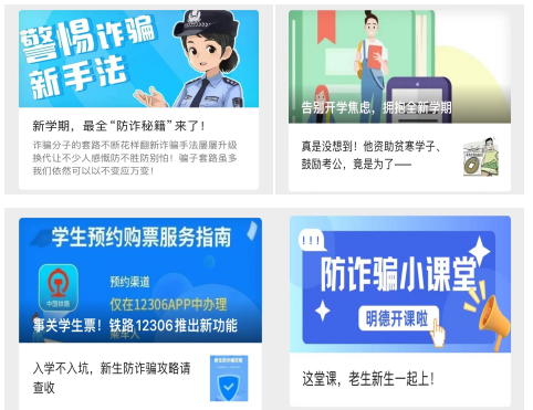 假期关怀常在线。学工部结合各类安全事件等信息,及时发布安全稳定风险提醒,并通过新媒体平台推出多期安全教育专题栏目,提升学生安全意识与自我保护能力。