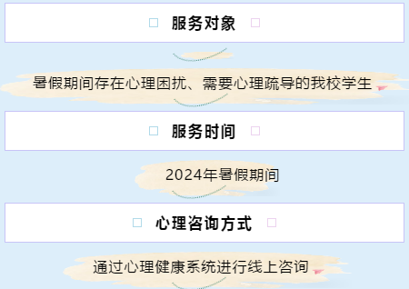 为做好假期学生心理健康服务工作,学校大学生心理健康教育中心在暑假期间继续面向全体学生开展线上心理咨询服务,为有需要的学生提供心理支持。