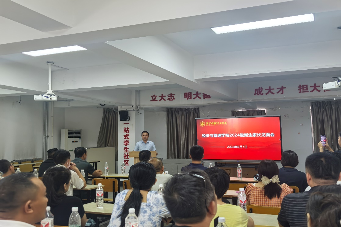 为让新生家长全面了解二级学院学科专业建设、教育教学质量、人才培养体系和育人成效,促进家校协同育人。经济与管理学院于9月7日下午在梅苑“一站式”学生社区召开2024级新生家长见面会,学院班子成员、办公室主任、各专业负责人、新生班主任代表、辅导员及2024级新生家长参加了会议,见面会由学院党委书记兼行政副院长何文举主持。