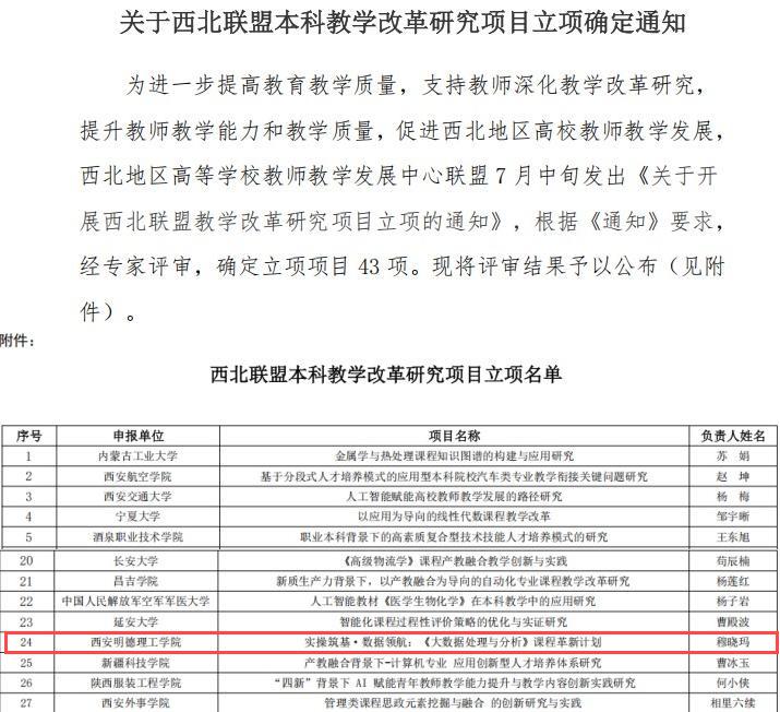 近日,从西北地区高等学校教师教学发展中心联盟传来喜讯,我校信息工程学院穆晓玛老师主持的《实操筑基・数据领航:<大数据处理与分析> 课程革新计划》经评审,成功获批立项,这标志着我校在本科教学改革领域又迈出了坚实的一步,实现了新的突破。
