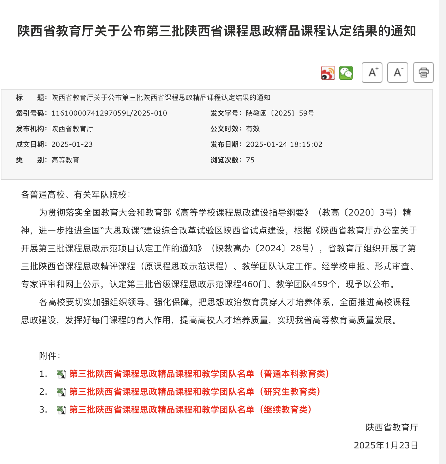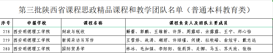 在刚刚公布的《陕西省教育厅关于公布第三批陕西省课程思政精品课程认定结果的通知》中,我校再创辉煌,喜获佳绩!共有解蕾老师及其团队的《财政与税收》、王雪娇老师及其团队的《新闻采访与写作》、林冰老师及其团队的《国际贸易学》3门课程脱颖而出,被认定为省级课程思政精品课程。包含2023年被认定的姚璐老师及其团队申报的《电视节目播音与主持》,至今我校共有省级课程思政课程4门(其中省级课程思政示范课程1门、省级课程思政精品课程3门)。