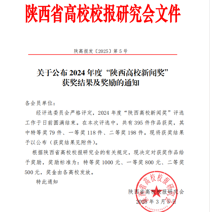 近日,陕西省高校校报研究会公布了2024年度“陕西高校新闻奖”评选结果,我校推荐报送的作品喜获佳绩,共荣获一等奖1项、二等奖7项。