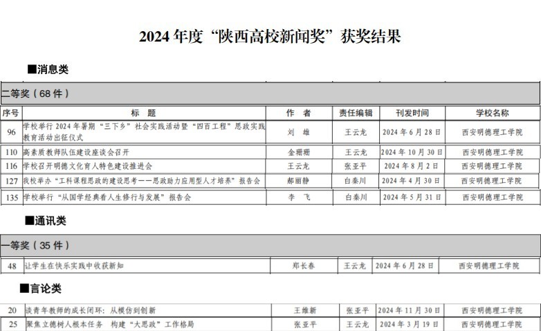由郑长春撰写的《让学生在快乐实践中收获新知》获通讯类作品一等奖;由刘雄撰写的《学校举行2024年暑期“三下乡”社会实践活动暨“四百工程”思政实践教育活动出征仪式》、金珊珊撰写的《高素质教师队伍建设座谈会召开》、王云龙撰写的《学校召开明德文化育人特色建设推进会》、郝丽静撰写的《我校举办“工科课程思政的建设思考--思政助力应用型人才培养”报告会》、李飞撰写的《学校举行“从国学经典看人生修行与发展”报告会》获消息类作品二等奖,王维新撰写的《谈青年教师的成长闭环:从模仿到创新》、张亚平撰写的《聚焦立德树人根本任务 构建“大思政”工作格局》获言论类作品二等奖。