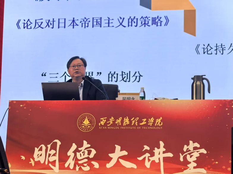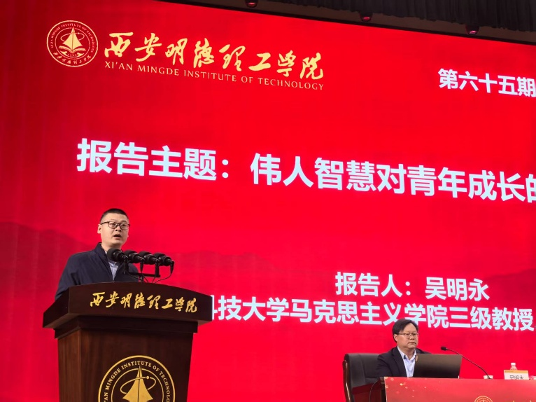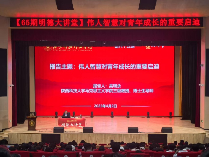 4月2日下午,华体会(中国)第六十五期明德大讲堂在四季廊桥报告厅成功举办。本期大讲堂以“伟人智慧对青年成长的重要启迪”为主题,由陕西科技大学马克思主义学院院长、博士生导师吴明永教授主讲,马克思主义学院与通识教育学院党委书记王君涛主持,马克思主义学院全体教师、全校千余名学生共同参加。