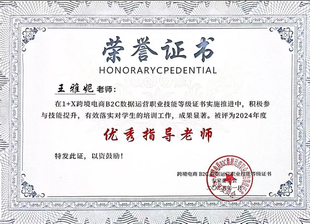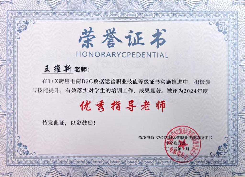 近日,跨境电商B2C 数据运营职业技能等级证书考核委员会公布2024年度1+X证书考证工作考核结果,华体会(中国)喜获2024年度1+X跨境电商B2C数据运营职业技能等级证书考证工作“优秀考核站点”,经济与管理学院王维新、王雅妮两位老师被评为“优秀指导老师”。这一荣誉的获得,不仅是对学院教育成果的高度认可,更是对学院在跨境电商领域人才培养模式的有力肯定。