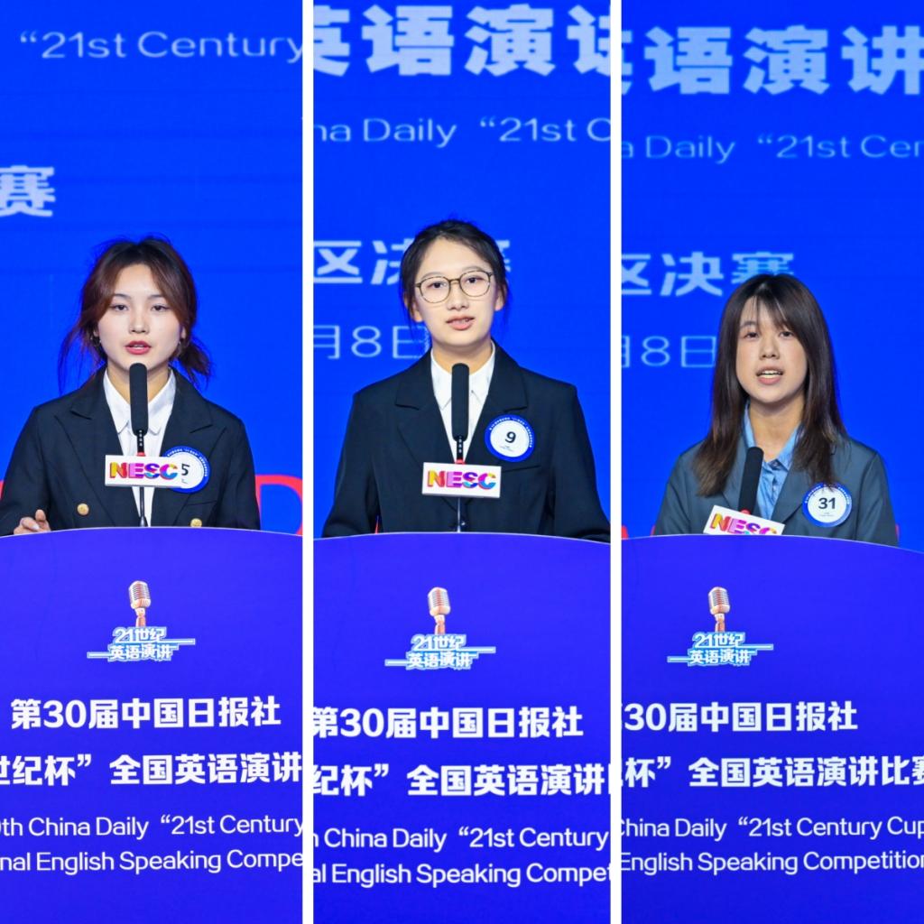 “21世纪杯”全国大学生英语演讲比赛由中国日报社创办于1996年,2023年被纳入《全国普通高校大学生竞赛分析报告》的竞赛目录,是我国官方认可的全国性赛事之一,也是国际公众演讲比赛(IPSC)中国区唯一选拔平台。30年来,该赛事获奖选手中涌现出了李克强总理的口译员孙宁、央视英文频道知名主持人刘欣等大批国家外语人才。本届大赛启动以来,在有关领导和单位支持下,我校语言文化与传播学院英语演讲教学团队及其指导的MAPS明德英语公众演说协会精心筹办校园选拔赛。全校各年级、各专业近100余名选手报名参赛,胡烨、王蕊和刘思羽3名同学历经校园初赛、复赛的层层选拔,从中脱颖而出,为学校争得了荣誉。