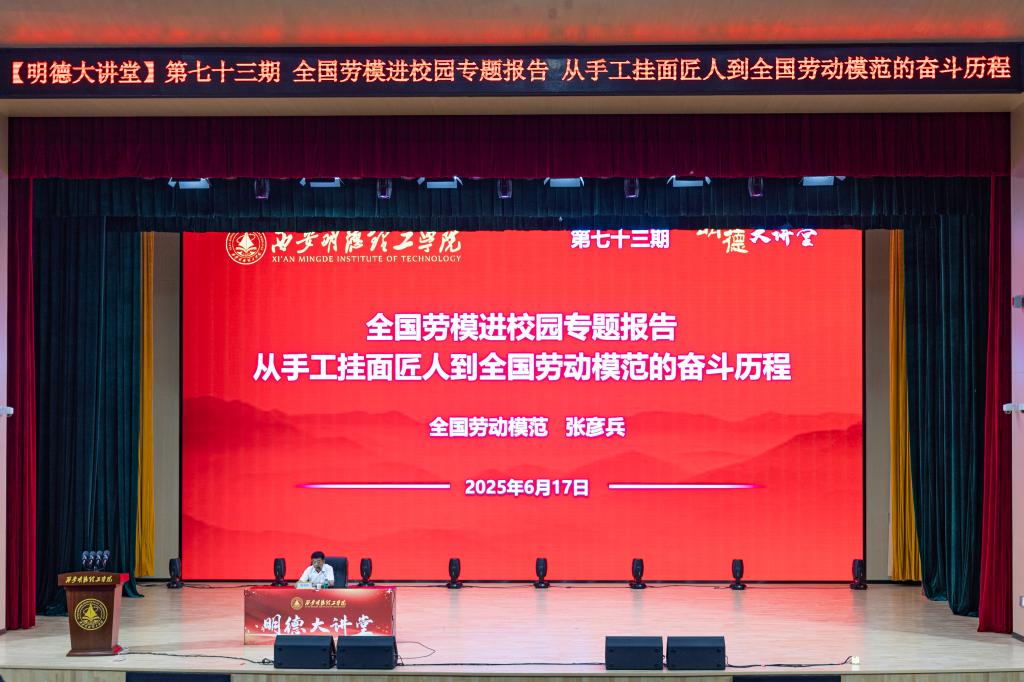6月17日下午,全国劳动模范、吴堡手工空心挂面非遗传承人张彦兵作客我校“明德大讲堂”。他以“手工挂面匠人到全国劳动模范的奋斗历程”为主题,为我校师生代表带来一堂融合匠心传承、产业振兴与时代使命的专题讲座。这位建国以来吴堡县首位全国劳模获得者,用二十余年坚守“一把面粉、一颗匠心”的故事,生动诠释了新时代劳动者的精神图谱。讲座由信息工程学院党委副书记高长江主持。