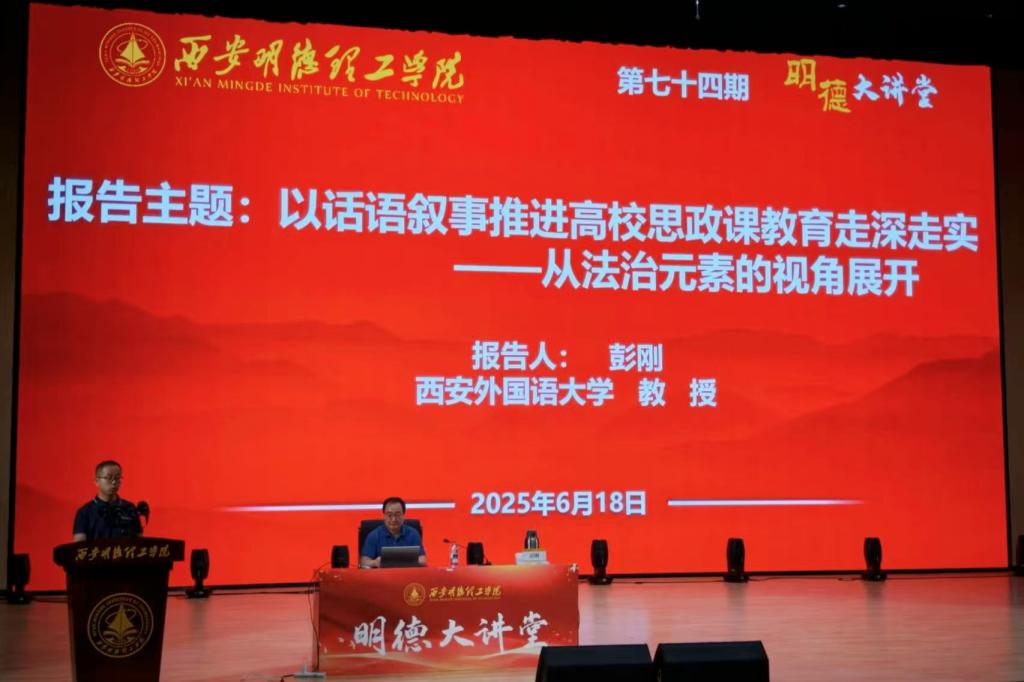 6月18日下午,华体会(中国)第七十四期明德大讲堂在四季廊桥报告厅成功举办。本期特邀西安外国语大学彭刚教授作主题为“以话语叙事推进高校思政课教育走深走实——从法治元素的视角展开”专题讲座。讲座由马克思主义学院副院长惠斌主持,思政课教师及千余名学生共同参加。