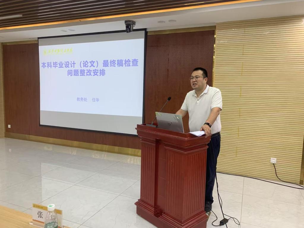教务处副处长任华部署了2025届毕业设计(论文)抽检整改工作,他要求各二级学院进一步完善毕业设计(论文)管理制度规范,构建分级整改的责任体系,建立详尽的“问题-措施-责任-时限”整改台账,制定出切实可行的整改工作方案,并逐一分析了领导干部听评课、同行评价、教师评学和学生评教存在的问题,建议二级学院质管员定期导出并筛选学院未参评教师及未被评教师名单,有针对性地推进各类教学评价工作的开展。