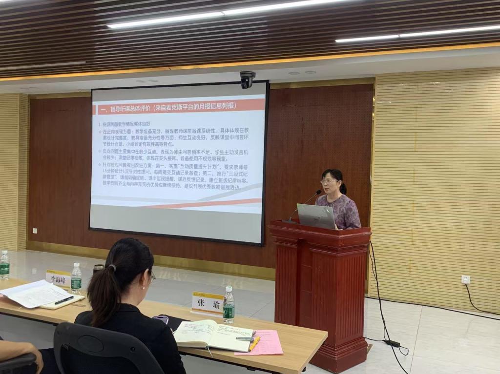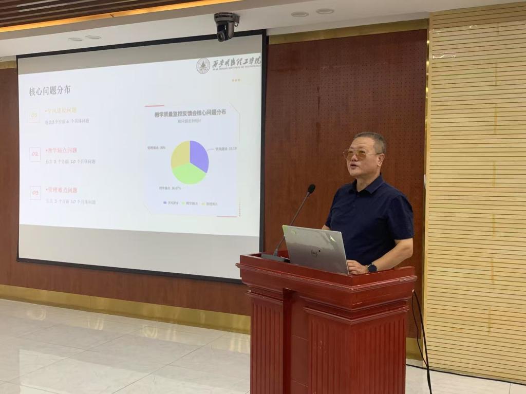 陈爱玲教授作为教学督导组代表从校级、院级两个层面反馈了5至6月教学督导听评课的总体情况、存在问题和改进建议。她指出,我校教学情况整体良好,教师教学准备充分、教案设计完整、师生互动良好,但也存在课堂纪律松散等学风问题,建议推行“三段式纪律管理”,课前明确规则、课中巡视提醒、课后反馈记录,建立班级纪律档案。陈教授详细汇报了2025届毕业设计(论文)答辩现场检查情况。从检查情况来看,绝大多数答辩现场秩序井然、程序规范,答辩组教师严谨负责,答辩学生态度端正。但在检查中也发现个别现场缺乏答辩标识与布置、个别现场时间安排缩水明显、部分学生不够自信等问题,建议进一步加强毕业答辩组织安排,注重答辩现场布置,营造良好答辩氛围。
