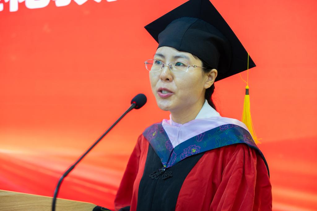 教师代表马桂花教授在发言中鼓励毕业生永葆感恩之心、学习之志和家国情怀,做一个懂得感恩、终身学习、心系家国的人。她讲到,在人工智能、大数据等技术日新月异的时代,保持求知的热情和终身学习的态度至关重要,希望毕业生们将个人价值融入国家和社会发展中,在担当中成长,在奉献中成就自我。