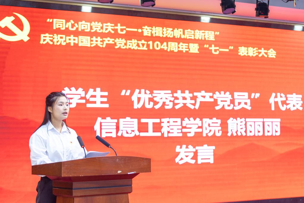 语言文化传播学院徐微作为教工优秀共产党员代表发言,她回望了自己近30年党龄和教龄的岁月,深情讲述了坚守为党育人、为国育才的初心使命,践行用外语讲好中国共产党和中国故事的光辉过往。信息工程学院熊丽丽作为学生优秀共产党员代表发言,分享了自己从参军入伍到退役复学的成长经历以及对“党员”二字的理解与感悟。经济与管理学院柴娜同学代表全体预备党员郑重承诺,将持续强化理论武装,锤炼过硬作风,勇担评估责任,切实把个人追求融入党和人民的事业之中。